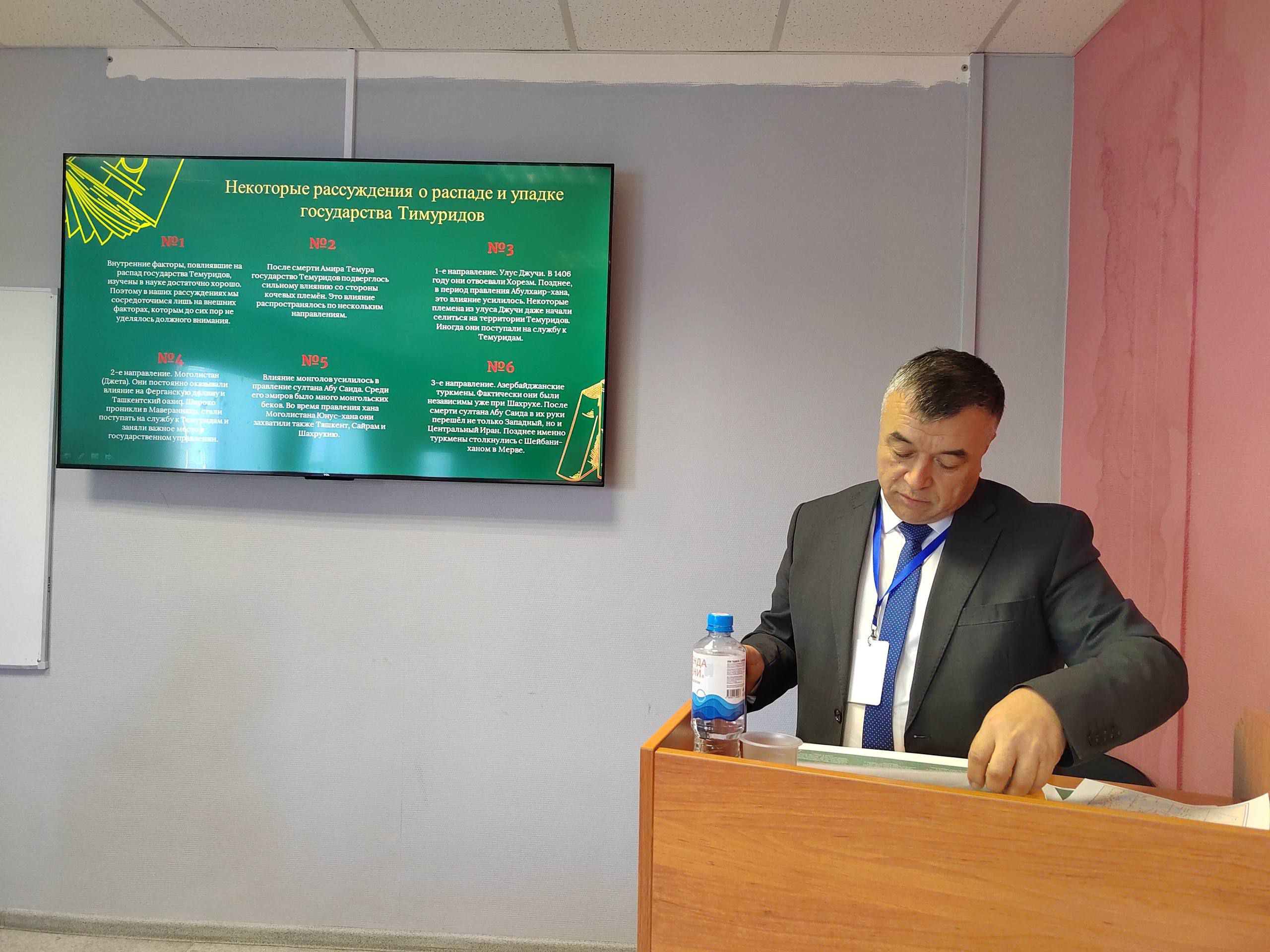 Mazkur konferensiyada O‘zbekistonni munosib tarzda O‘zbekiston tarixi kafedrasi mudiri, tarix fanlari doktori, professor Bahodir Abduqodirovich Usmonov taqdim etdi. U forumda “Ослабление и распад государства темуридов в Хорасане” (Xurosonda Temuriylar davlatining zaiflashuvi va parchalanishi) nomli ilmiy maqolasi bilan ishtirok etib, xalqaro ilmiy jamoatchilik e’tiborini qozondi.