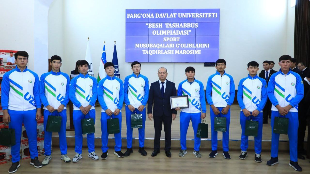 Farg‘ona davlat universitetida yoshlar o‘rtasida sog‘lom raqobat, jamoaviylik va sportga muhabbatni yanada kuchaytirishga qaratilgan “Besh tashabbus olimpiadasi” musobaqalarining yakuniy taqdirlash marosimi bo‘lib o‘tdi. Olimpiada doirasida voleybol, stritbol, yengil atletika, stol tennisi va mini-futbol kabi ommabop sport turlari bo‘yicha bahslar o‘tkazildi.