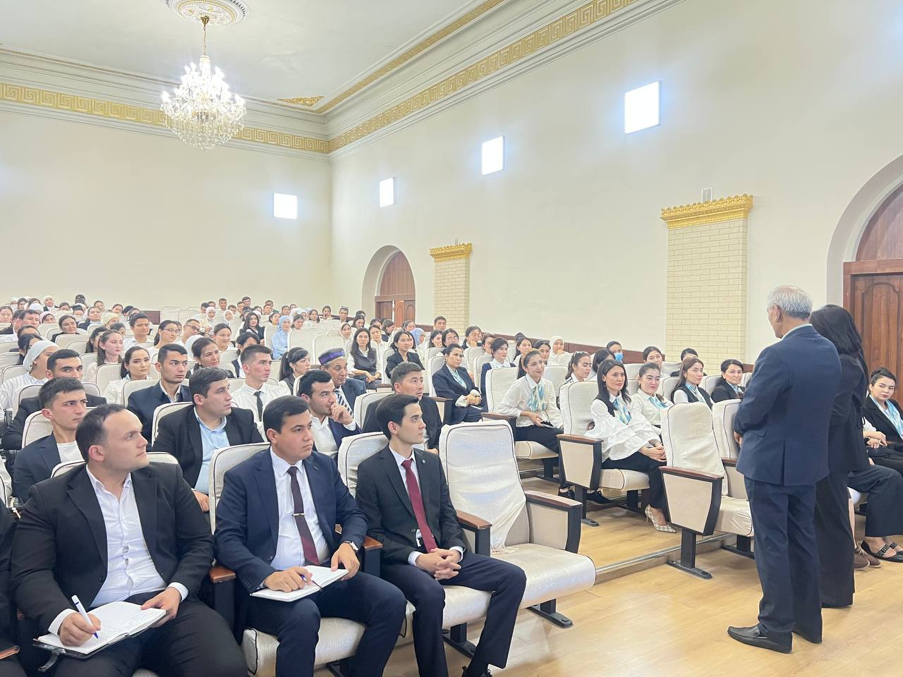 Shu doirada bugun universitet katta majlislar zalida navbatdagi muhim tadbir bo‘lib o‘tdi. Tadbir mehmoni — O‘zbekiston Respublikasi Prezidenti huzuridagi Davlat siyosati va boshqaruvi akademiyasi professori, taniqli sotsiolog olim Mansurjon Bekmurodov bo‘ldi.