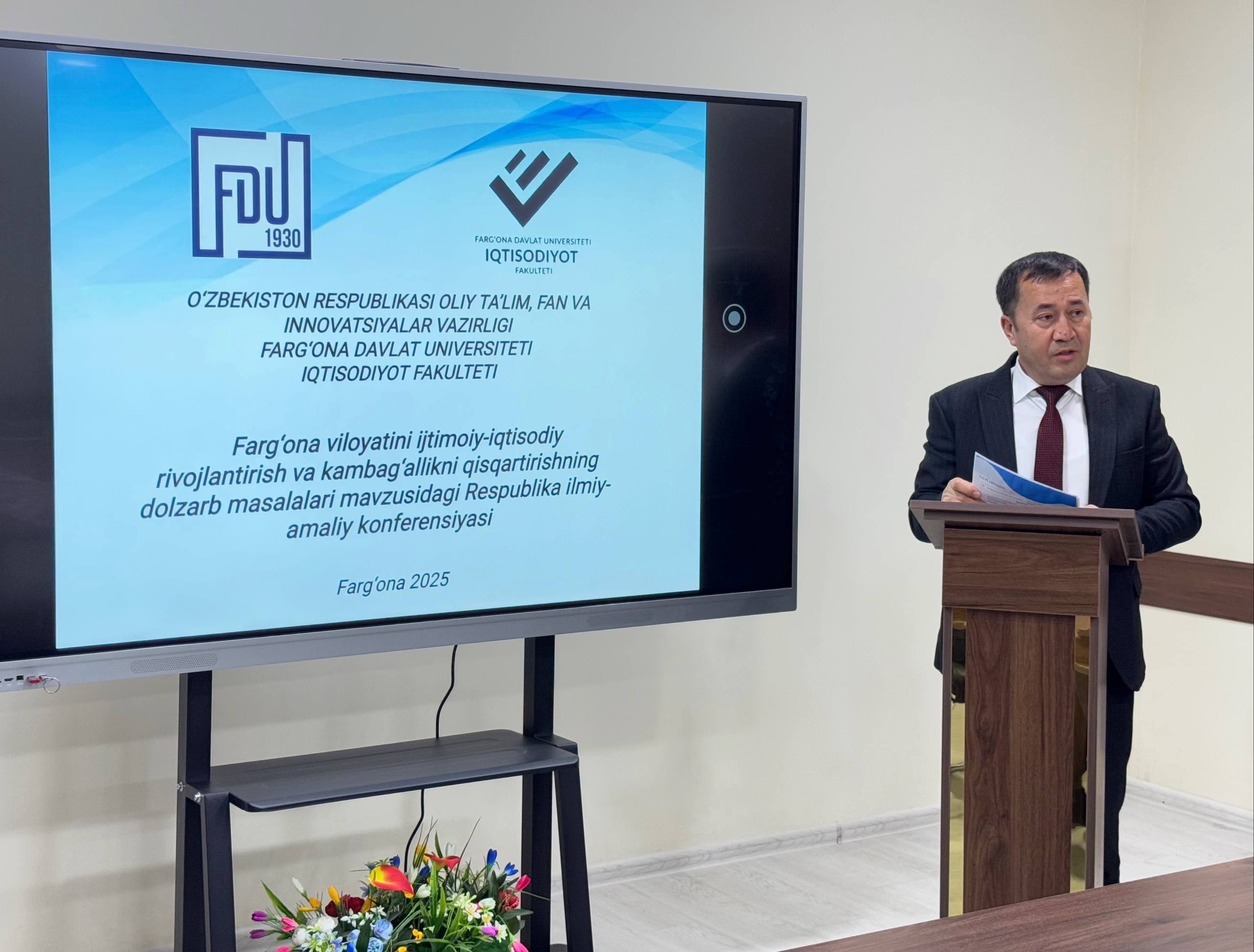 Farg‘ona davlat universiteti Iqtisodiyot fakulteti Jahon va mintaqa iqtisodiyoti kafedrasi tomonidan dolzarb mavzuga bag‘ishlangan muhim ilmiy tadbir — “Farg‘ona viloyatini ijtimoiy-iqtisodiy rivojlantirish va kambag‘allikni qisqartirishning dolzarb masalalari” mavzusida Respublika ilmiy-amaliy anjumani bo‘lib o‘tdi.