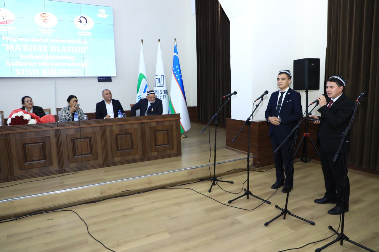 Farg‘ona davlat universitetida “Ma’rifat ulashib” loyihasi doirasida o‘tkazilgan adabiy tadbirlar haqiqiy ijod bayramiga aylandi. Universitetga tashrif buyurgan taniqli ijodkorlar — Muhammad Siddiq, Gulbahor Jumayeva va Xosiyat Bobomurodova talabalar va professor-o‘qituvchilar tomonidan iliq kutib olindi. Ularning samimiy tabassumi, mehrga to‘la nigohi va qalbidan to‘kilgan she’riy misralar FarDU muhitiga yangi ruh, yangi zavq olib kirdi.