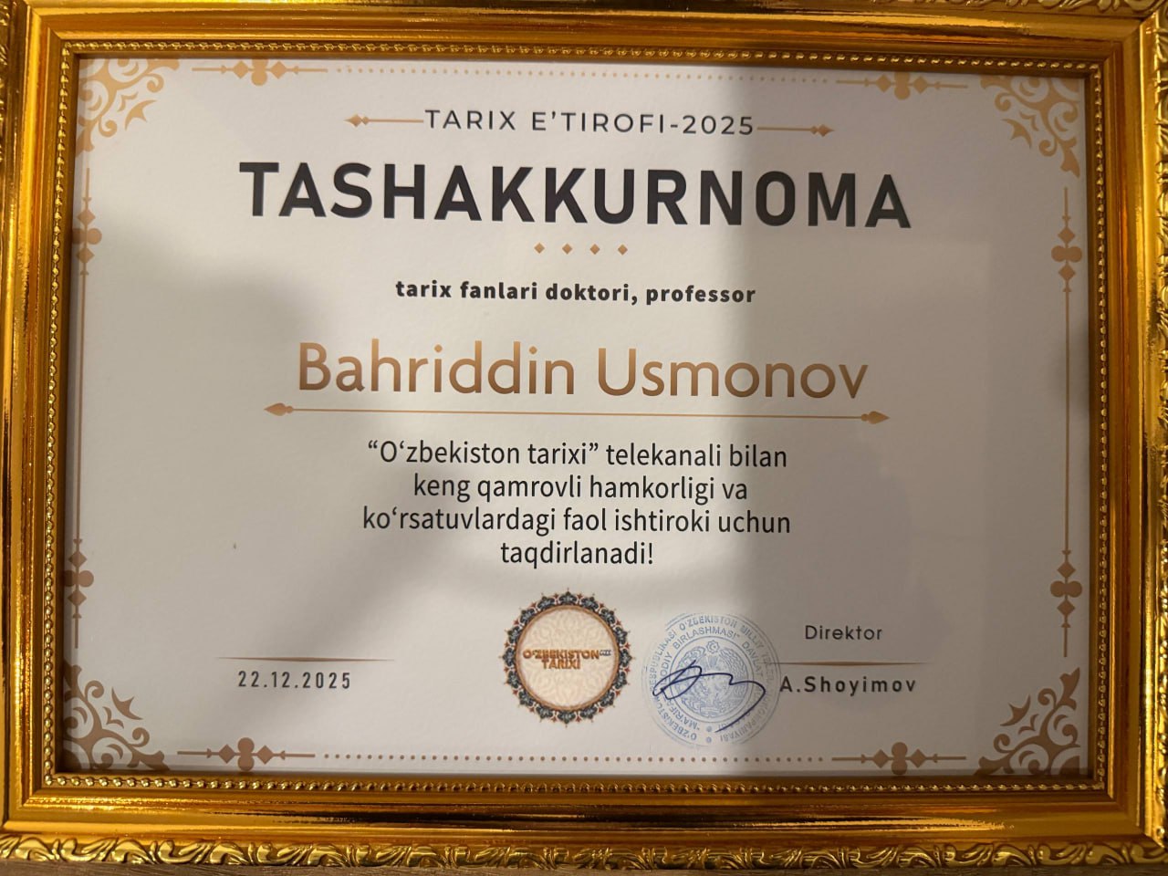 Tadbirning eng quvonarli va e’tiborga molik jihatlaridan biri — Ustozimiz Usmonov Baxriddin Axmedovichning munosib taqdirlanishi bo‘ldi. U kishi “O‘zbekiston tarixi” telekanali bilan ko‘p yillik samarali hamkorligi, shuningdek, Temuriylar davri tarixini chuqur ilmiy asosda o‘rganib, uni xalqimiz ongiga singdirishdagi beqiyos xizmatlari uchun O‘zbekiston Milliy teleradiokompaniyasi rahbariyati tomonidan alohida e’tirof etildi.