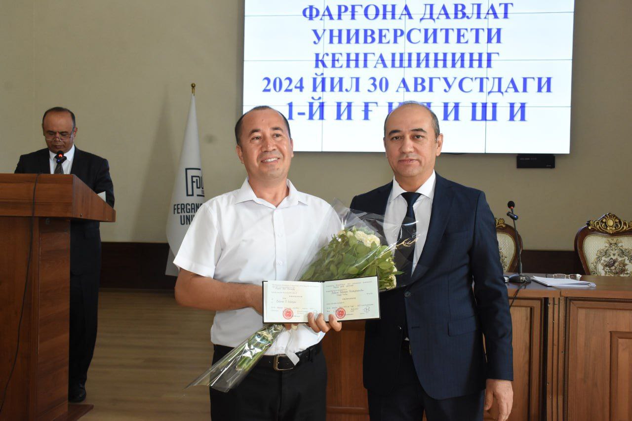Bugun Farg'ona davlat universiteti Kengashining yangi o'quv yilidagi I sonli yig'ilishi bo'lib o'tdi. Kengash avvalida ilmiy darajalar va unvonlarga erishgan 40 nafarga yaqin professor-o'qituvchilar munosib taqdirlandilar.Oliygoh rahbari Bahodirjon Shermuhammadov ularni samimiy muborakbod etar ekan, ilm yo'lida olib borayotgan mashaqqatli faoliyatlarida zafarlar tiladi."Mustaqilligimizning 33 yilligi arafasida jamoada olimlarimiz ko'payib, ilmiy salohiyatning yuksalib borayotgani barchamizni yutug'imizdir" - deya ta'kidladi rektor o'z tabrik nutqida.