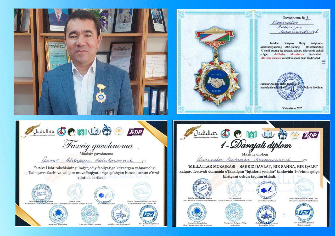 Farg‘ona davlat universiteti Filologiya fakulteti Adabiyotshunoslik kafedrasi o‘qituvchisi, filologiya fanlari bo‘yicha falsafa doktori (PhD) Umurzaqov Rustamjon Maxamadovich xalqaro miqyosda yuqori e’tirofga sazovor bo‘ldi. U Jadidlar Xalqaro Ilmiy Tadqiqotlar Assotsiatsiyasi tomonidan tashkil etilgan “Millatlar Mozaikasi” xalqaro festivali doirasida “Do‘stlik elchisi” ko‘krak nishoni bilan taqdirlandi.