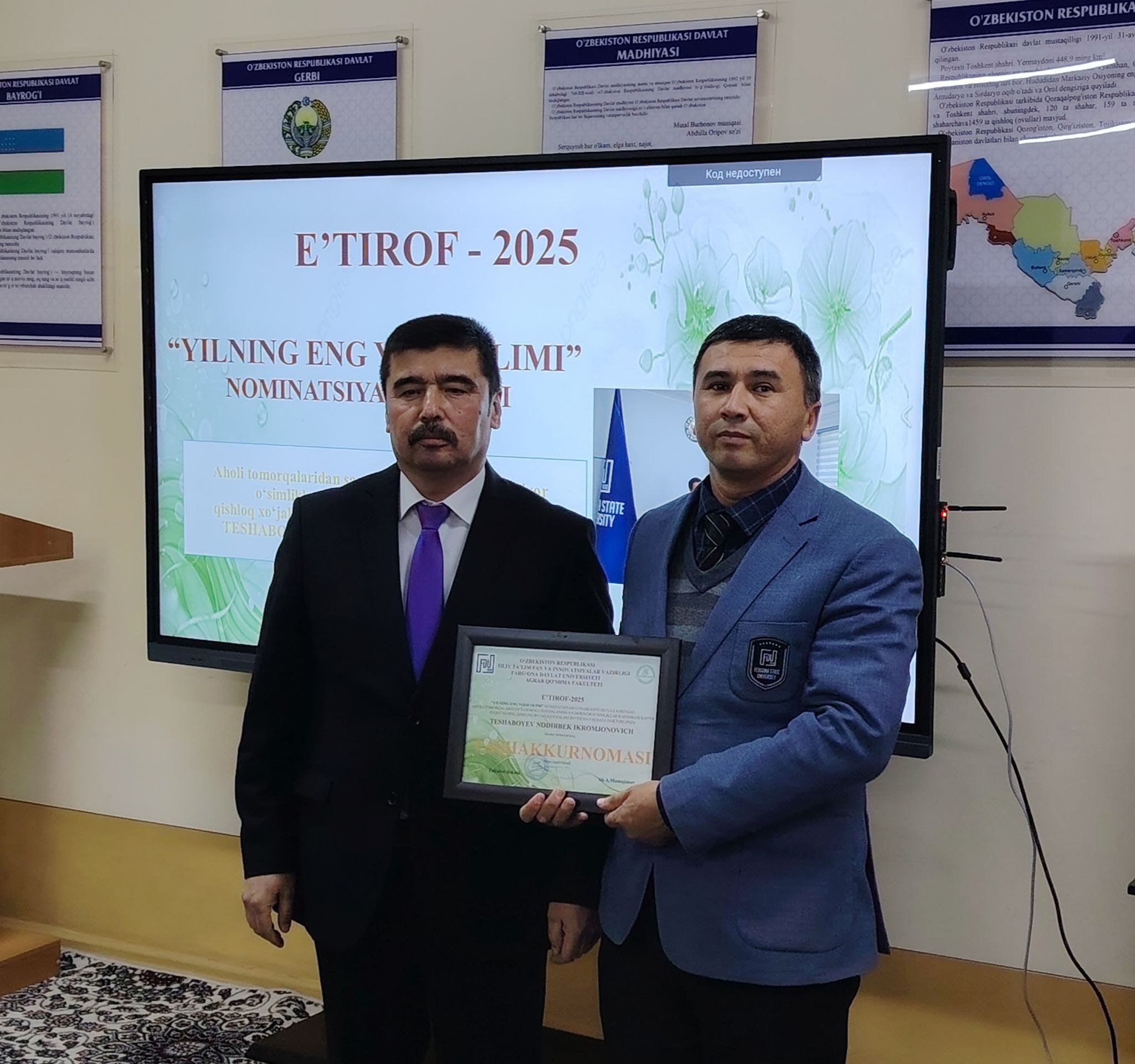 Farg’ona davlat universitetining Agrar qo‘shma fakulteti rahbariyati tomonidan o‘tkazilgan tantanali marosimda fakultetning eng faol va yutuqli a’zolari taqdirlandi. Ushbu an’ana fakultetimizdagi ilmiy va ta’limiy jarayonlarni rag‘batlantirish, yosh olimlarni qo‘llab-quvvatlash hamda bilimdon ustozlarimizni e’tirof etish maqsadida har yili o‘tkazib kelinadi.