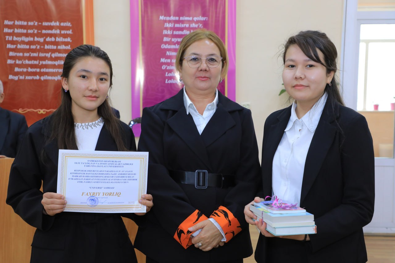 Fargʻona davlat universitetida o‘tkazilgan Kitobxonlik haftaligi yakuniga bag‘ishlangan tantanali taqdirlash marosimi bo‘lib o‘tdi. Ushbu tadbir kitobxonlikni keng targ‘ib qilish, yoshlar orasida mutolaa madaniyatini rivojlantirishga qaratilgan muhim tashabbuslarning mantiqiy davomi bo‘ldi.