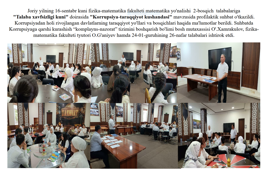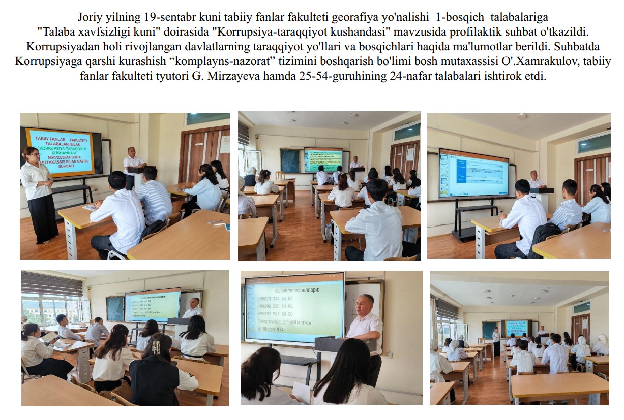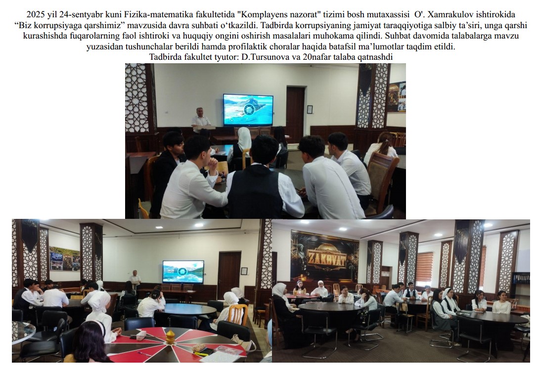 Yoshlarda korrupsiyaga qarshi kurashish bo‘yicha faol dunyoqarash va mustahkam fuqarolik pozitsiyasini shakllantiruvchi chora-tadbirlarni amalga oshirish |