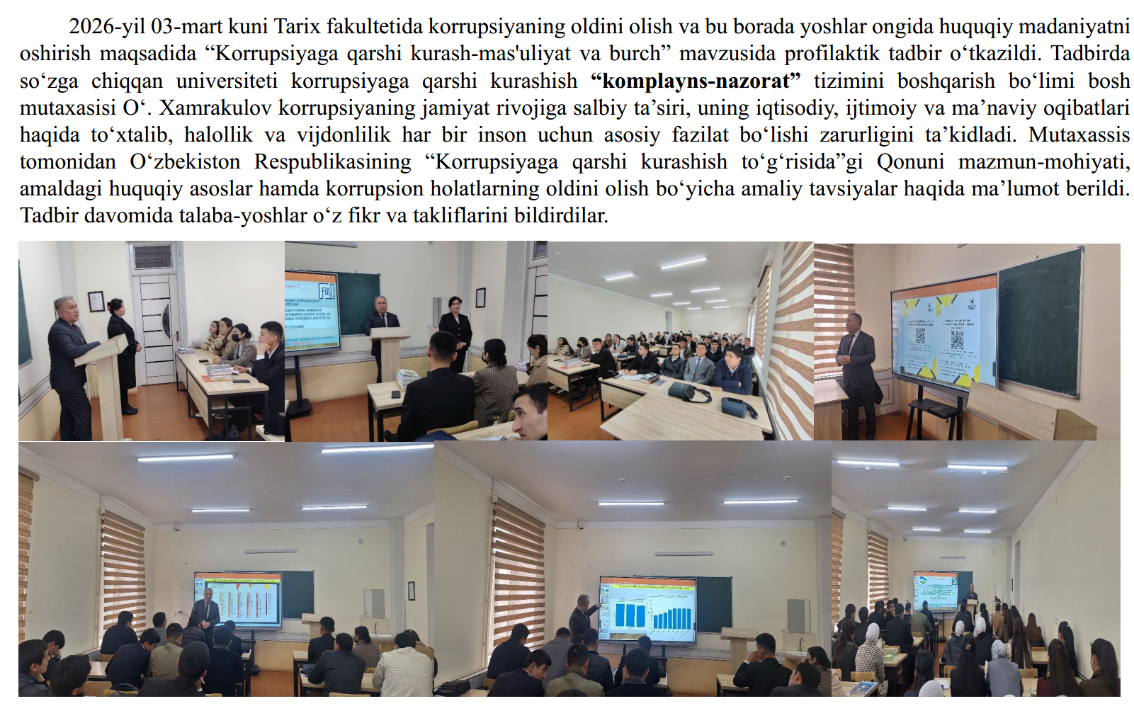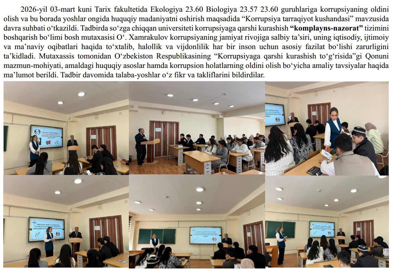 2026-yil 16-fevral kuni Jismoniy ma’daniyat fakultetining 1-bosqich talabalariga Farg‘ona davlat universiteti Korrupsiyaga qarshi kurashish “komplayns-nazorat” tizimini boshqarish bo‘limi bosh mutaxassisi O‘.Xamrakulov va universitet yuridik byurosi boshlig‘i D.Maxamadov, Farg'ona davlat universitetida Oliy ta’lim, fan va innovatsiyalar vazirligining 2026-yil 6-fevraldagi 02/23-613-son xati ijrosini ta’minlash maqsadida 2026-yil 16-fevral kuni universitetning professor-o‘qituvchilari, xodimlari va talabalari bilan “Moliayaviy huquqbuzarlik hamda yashirish iqtisodiyotga toqatsizlik pozitsiyasini shakllantirish” mavzusida davra suhbati o‘kazildi. Mavzuni yoritish jarayonida universitetning Korrupsiyaga qarshi kurashish bo‘limi xodimlari tomonidan O‘zbekiston Respublikasi Prezidentining 2025-yil 26-dekabrdagi “Davlat xaridlari tizimida raqobat muhiti va shaffoflikni ta’minlash bo‘yicha navbatdagi chora-tadbirlar to‘g‘risida”gi Prezident Farmoni (PF–259-son, 26.12.2025 y.) mazmun-mohiyatiga izox erildi.