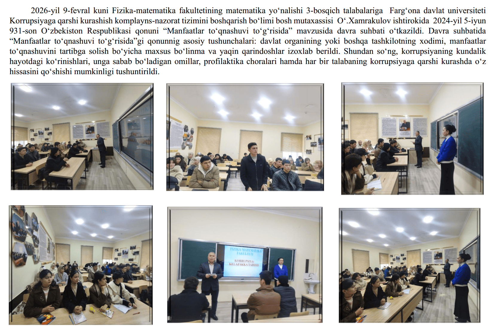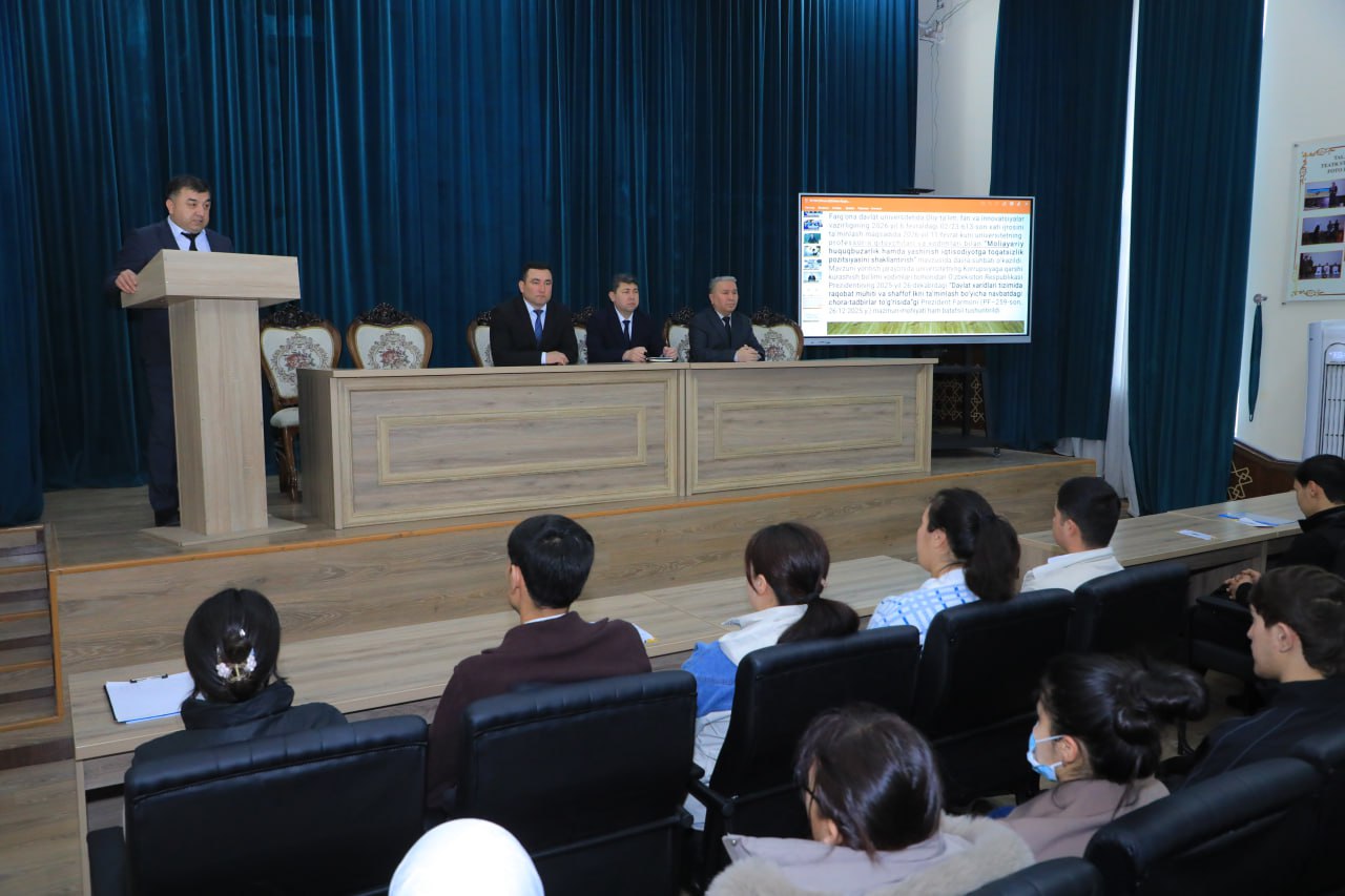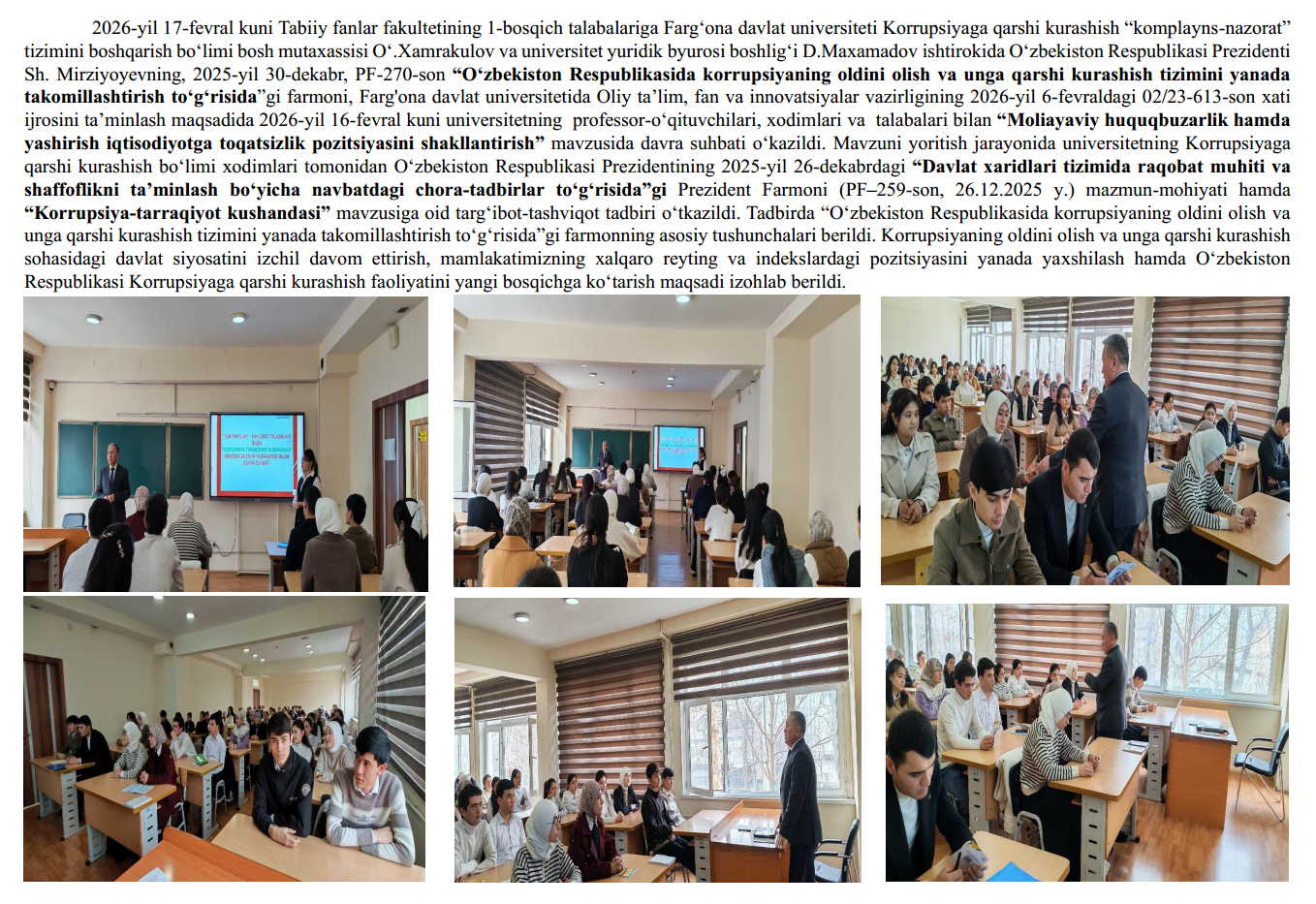 2026-yil 18-fevral kuni Fizika-matematika fakultetining 2-bosqich talabalariga Farg‘ona davlat universiteti Korrupsiyaga qarshi kurashish “komplayns-nazorat” tizimini boshqarish bo‘limi bosh mutaxassisi O‘.Xamrakulov ishtirokida O‘zbekiston Respublikasi Prezidenti Sh. Mirziyoyevning, 2025-yil 30-dekabr,