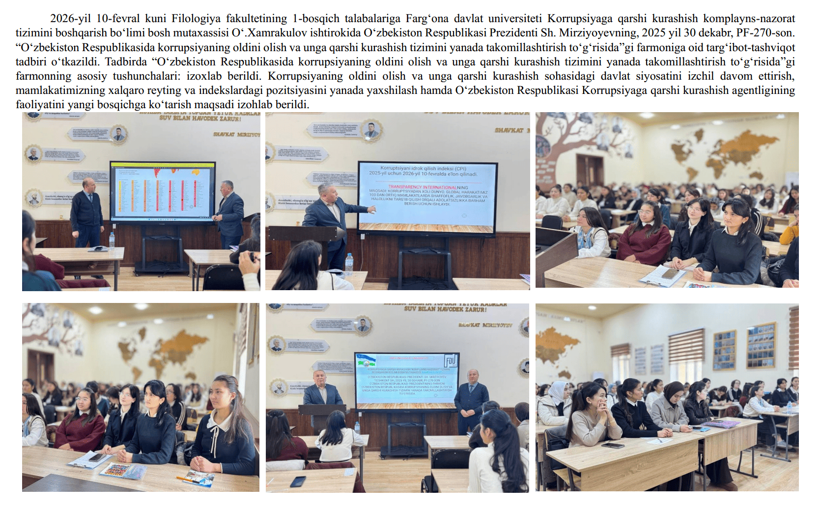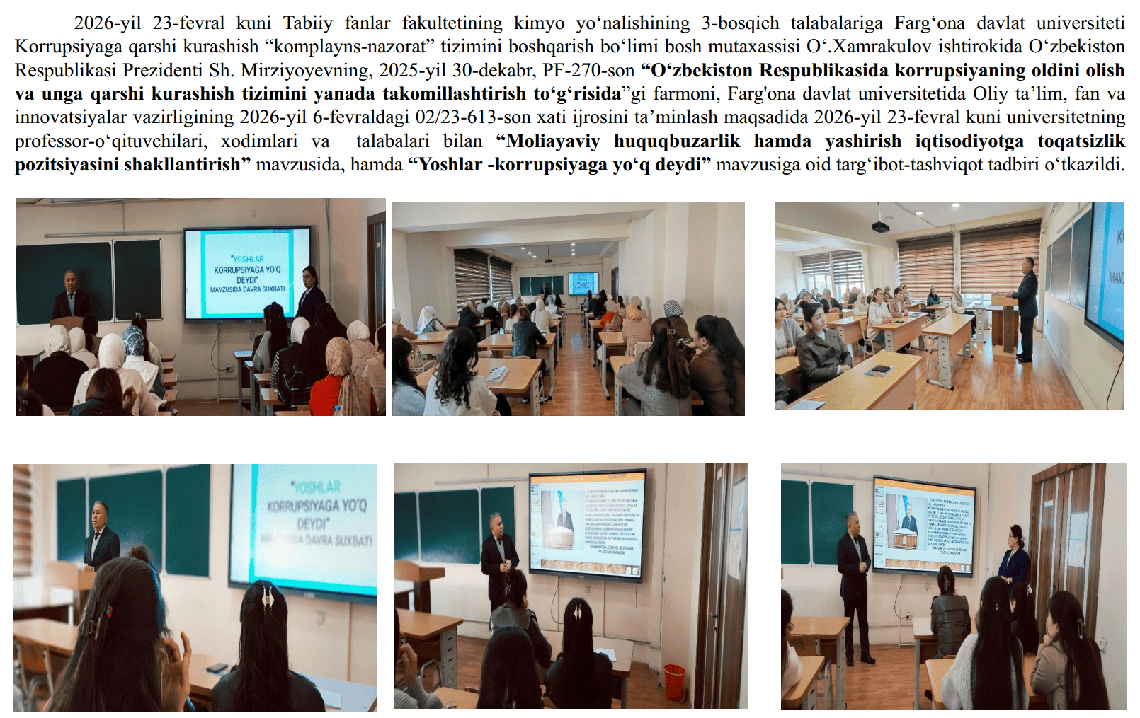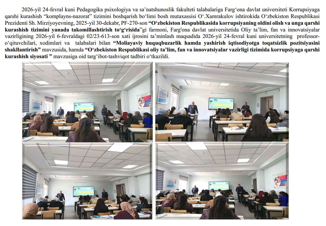 2026-yil 18-fevral kuni Fizika-matematika fakultetining 2-bosqich talabalariga Farg‘ona davlat universiteti Korrupsiyaga qarshi kurashish “komplayns-nazorat” tizimini boshqarish bo‘limi bosh mutaxassisi O‘.Xamrakulov ishtirokida O‘zbekiston Respublikasi Prezidenti Sh. Mirziyoyevning, 2025-yil 30-dekabr,