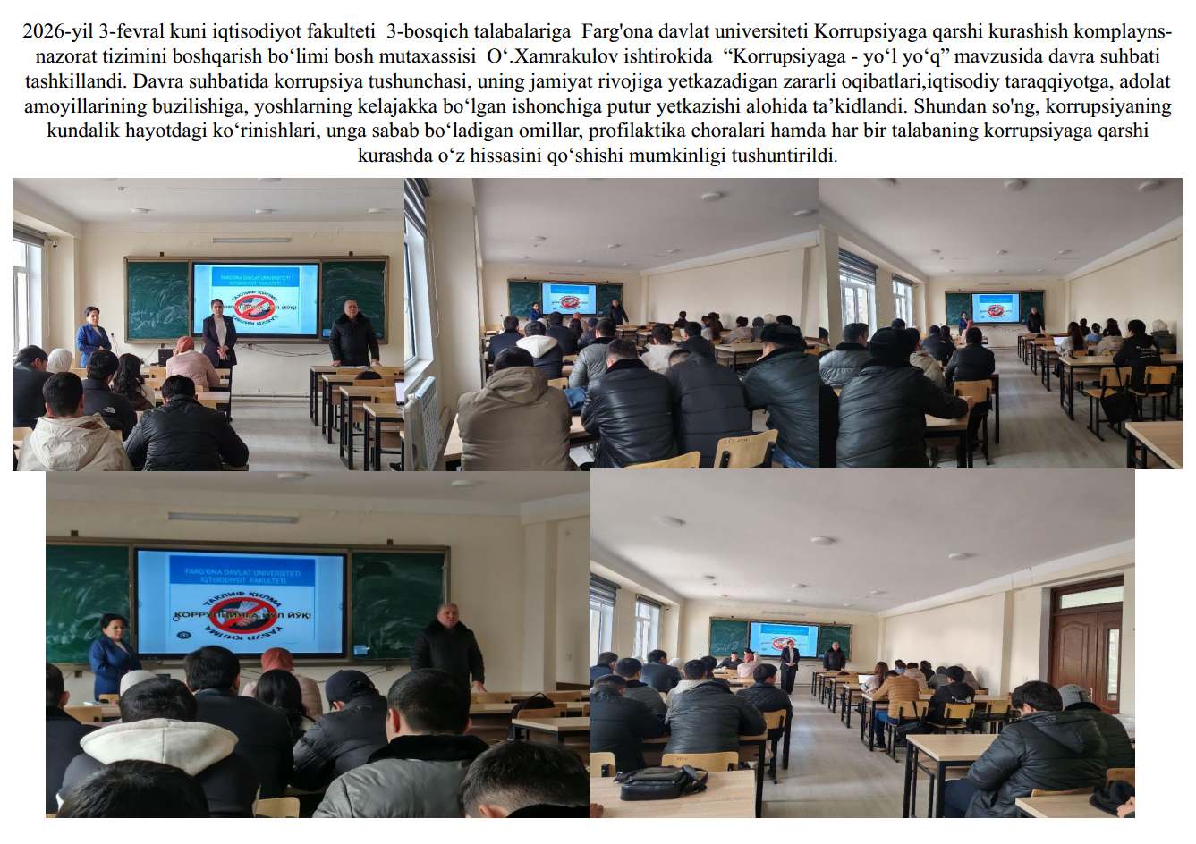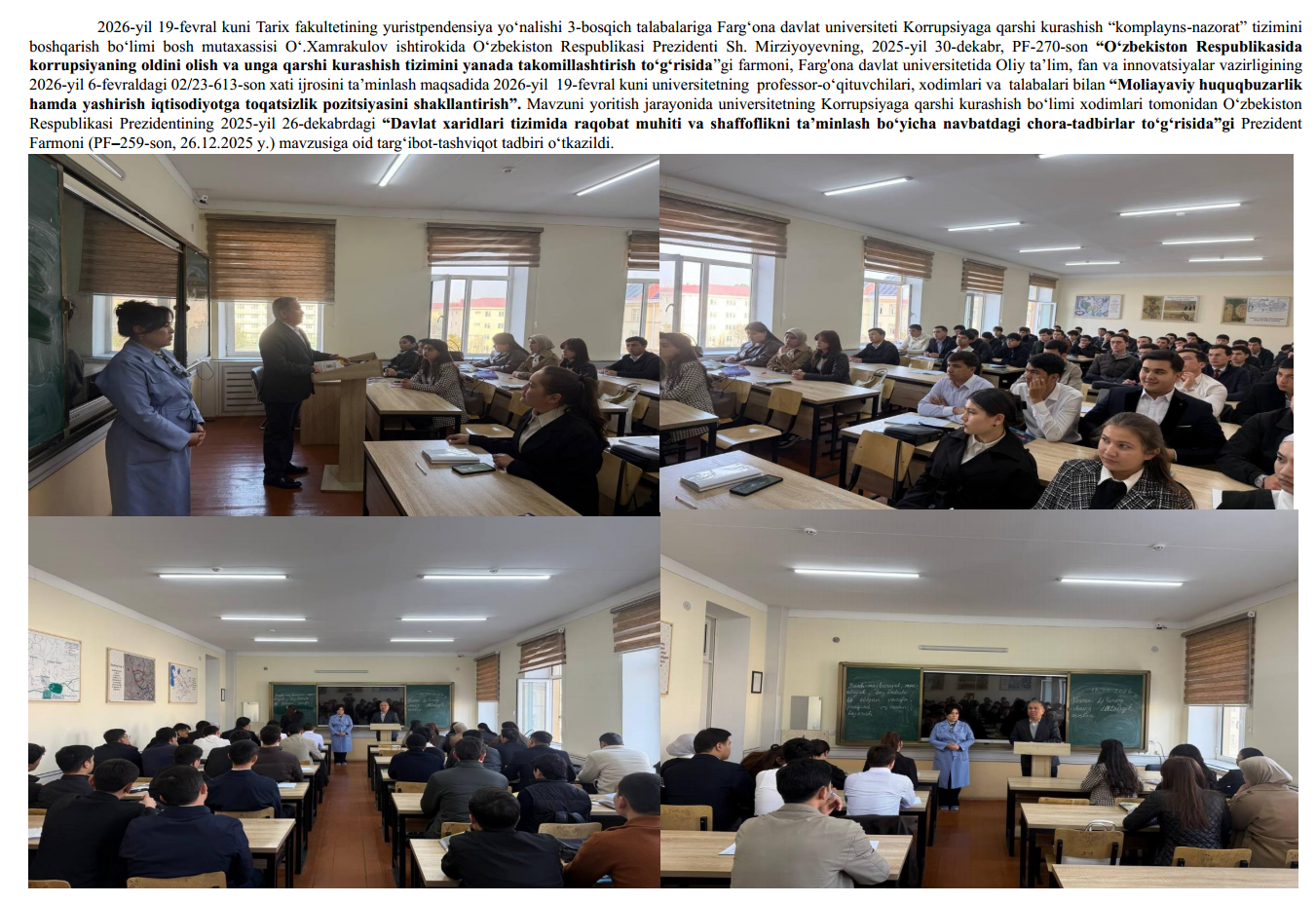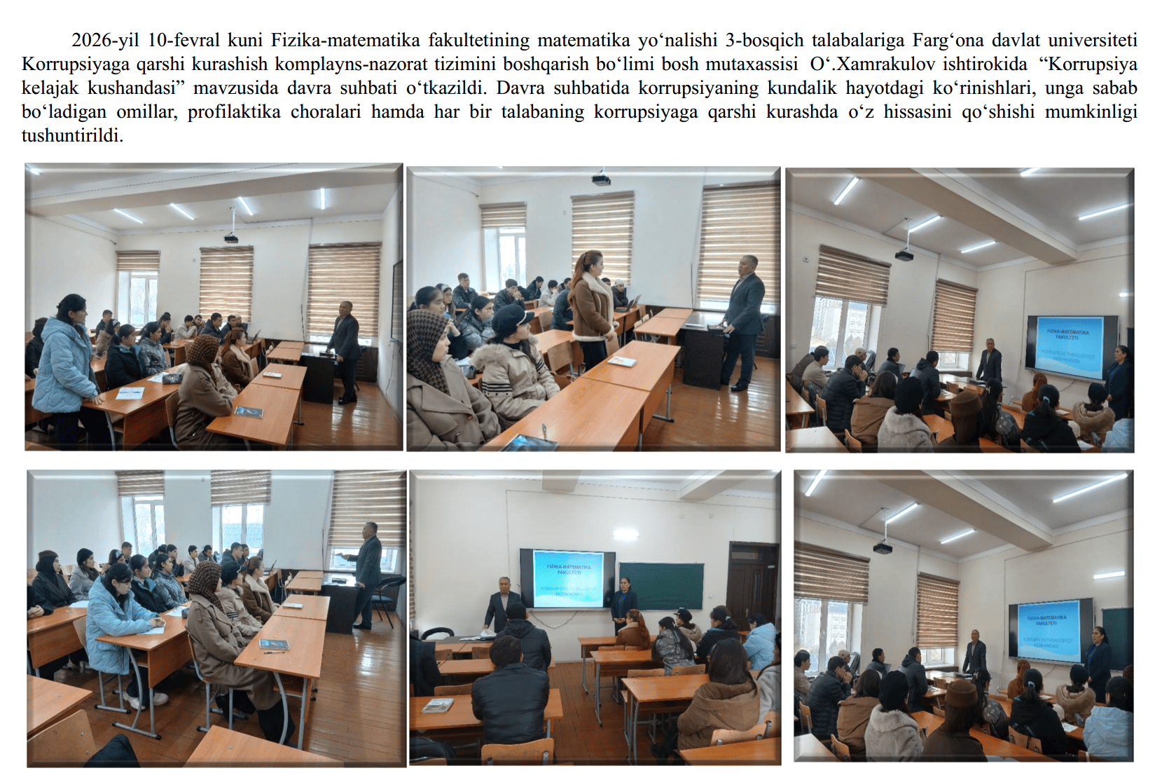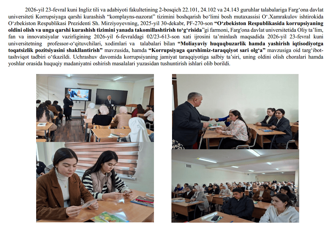 2026-yil 13-fevral kuni Fizika-matematika fakultetining 2-bosqich talabalariga Farg‘ona davlat universiteti Korrupsiyaga qarshi kurashish “komplayns-nazorat” tizimini boshqarish bo‘limi bosh mutaxassisi O‘.Xamrakulov ishtirokida O‘zbekiston Respublikasi Prezidenti Sh. Mirziyoyevning, 2025-yil 30-dekabr, PF-270-son “O‘zbekiston Respublikasida korrupsiyaning oldini olish va unga qarshi kurashish tizimini yanada takomillashtirish to‘g‘risida”gi farmoniga oid xamda , Farg'ona davlat universitetida Oliy ta’lim, fan va innovatsiyalar vazirligining 2026-yil 6-fevraldagi 02/23-613-son xati ijrosini ta’minlash maqsadida 2026-yil 13-fevral kuni universitetning professor-o‘qituvchilari, xodimlari va talabalari bilan “Moliayaviy huquqbuzarlik hamda yashirish iqtisodiyotga toqatsizlik pozitsiyasini shakllantirish” Mavzuni yoritish jarayonida universitetning Korrupsiyaga qarshi kurashish bo‘limi xodimlari tomonidan O‘zbekiston Respublikasi Prezidentining 2025-yil 26-dekabrdagi “Davlat xaridlari tizimida raqobat muhiti va shaffoflikni ta’minlash bo‘yicha navbatdagi chora-tadbirlar to‘g‘risida”gi Prezident Farmoni (PF–259-son, 26.12.2025 y.) mazmun-mohiyati mavzusida davra suhbati o‘kazildi.