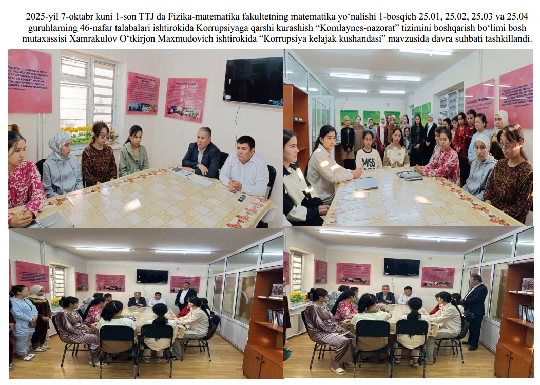 - professor-o‘qituvchilar, talaba-yoshlar o‘rtasida korrupsiyaga qarshi kurashishga qaratilgan turli tadbirlar tashkil etadi;