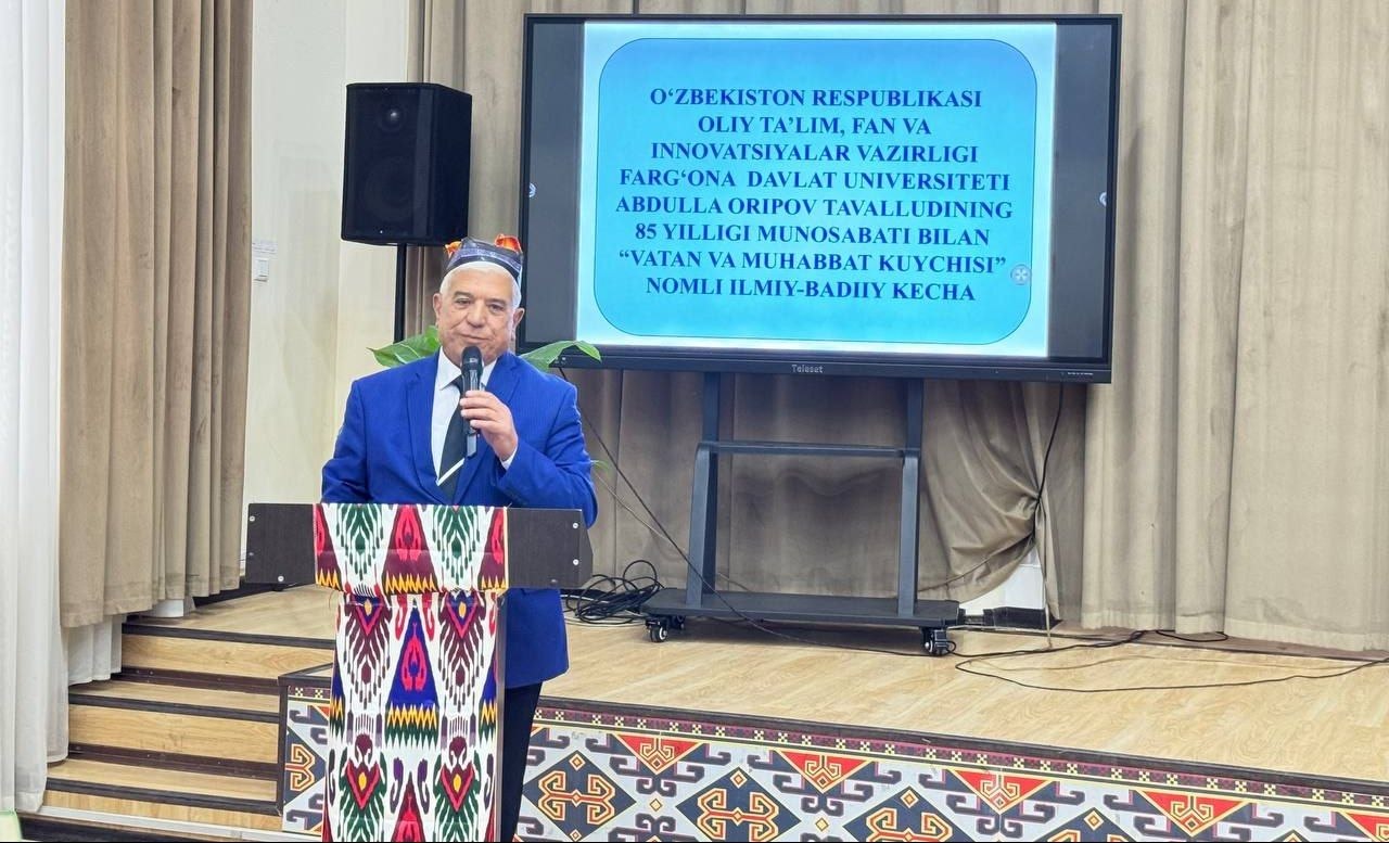 Fargʻona davlat universiteti Filologiya fakultetida 2026-yil 16-aprel kuni O‘zbekiston Qahramoni, atoqli shoir Abdulla Oripov tavalludining 85 yilligi munosabati bilan “Vatan va muhabbat kuychisi” nomli ilmiy-badiiy tadbir tashkil etildi. Ushbu ma’naviy-ma’rifiy anjuman buyuk ijodkor merosini chuqur o‘rganish va targ‘ib etishga bag‘ishlandi.