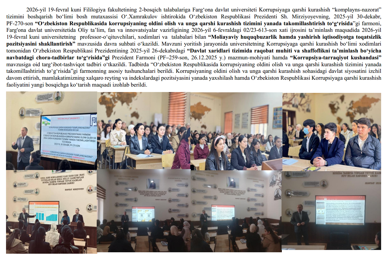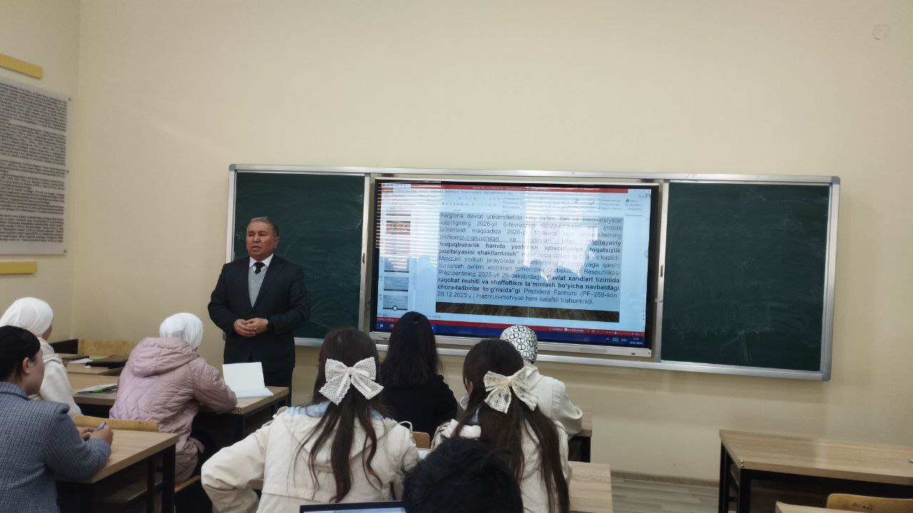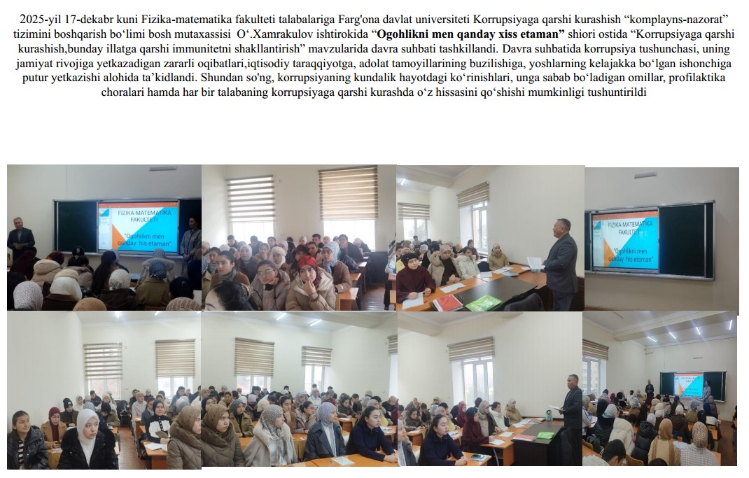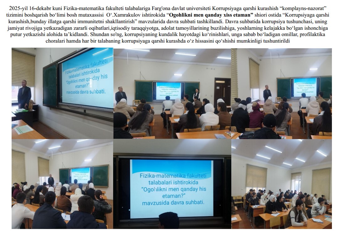 2026-yil 13-fevral kuni Fizika-matematika fakultetining 2-bosqich talabalariga Farg‘ona davlat universiteti Korrupsiyaga qarshi kurashish “komplayns-nazorat” tizimini boshqarish bo‘limi bosh mutaxassisi O‘.Xamrakulov ishtirokida O‘zbekiston Respublikasi Prezidenti Sh. Mirziyoyevning, 2025-yil 30-dekabr, PF-270-son “O‘zbekiston Respublikasida korrupsiyaning oldini olish va unga qarshi kurashish tizimini yanada takomillashtirish to‘g‘risida”gi farmoniga oid xamda , Farg'ona davlat universitetida Oliy ta’lim, fan va innovatsiyalar vazirligining 2026-yil 6-fevraldagi 02/23-613-son xati ijrosini ta’minlash maqsadida 2026-yil 13-fevral kuni universitetning professor-o‘qituvchilari, xodimlari va talabalari bilan “Moliayaviy huquqbuzarlik hamda yashirish iqtisodiyotga toqatsizlik pozitsiyasini shakllantirish” Mavzuni yoritish jarayonida universitetning Korrupsiyaga qarshi kurashish bo‘limi xodimlari tomonidan O‘zbekiston Respublikasi Prezidentining 2025-yil 26-dekabrdagi “Davlat xaridlari tizimida raqobat muhiti va shaffoflikni ta’minlash bo‘yicha navbatdagi chora-tadbirlar to‘g‘risida”gi Prezident Farmoni (PF–259-son, 26.12.2025 y.) mazmun-mohiyati mavzusida davra suhbati o‘kazildi.