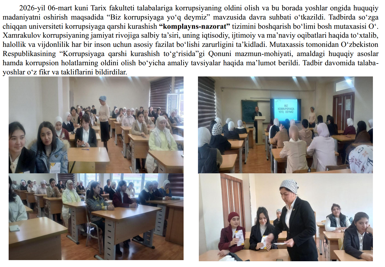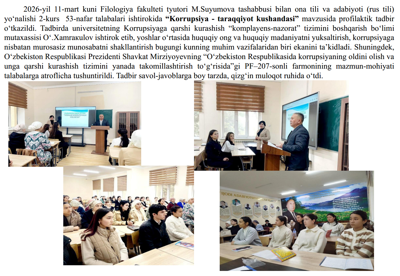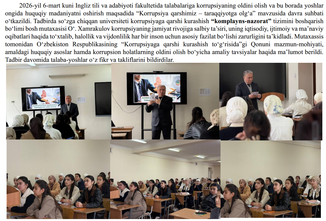 2026-yil 13-fevral kuni Fizika-matematika fakultetining 2-bosqich talabalariga Farg‘ona davlat universiteti Korrupsiyaga qarshi kurashish “komplayns-nazorat” tizimini boshqarish bo‘limi bosh mutaxassisi O‘.Xamrakulov ishtirokida O‘zbekiston Respublikasi Prezidenti Sh. Mirziyoyevning, 2025-yil 30-dekabr, PF-270-son “O‘zbekiston Respublikasida korrupsiyaning oldini olish va unga qarshi kurashish tizimini yanada takomillashtirish to‘g‘risida”gi farmoniga oid xamda , Farg'ona davlat universitetida Oliy ta’lim, fan va innovatsiyalar vazirligining 2026-yil 6-fevraldagi 02/23-613-son xati ijrosini ta’minlash maqsadida 2026-yil 13-fevral kuni universitetning professor-o‘qituvchilari, xodimlari va talabalari bilan “Moliayaviy huquqbuzarlik hamda yashirish iqtisodiyotga toqatsizlik pozitsiyasini shakllantirish” Mavzuni yoritish jarayonida universitetning Korrupsiyaga qarshi kurashish bo‘limi xodimlari tomonidan O‘zbekiston Respublikasi Prezidentining 2025-yil 26-dekabrdagi “Davlat xaridlari tizimida raqobat muhiti va shaffoflikni ta’minlash bo‘yicha navbatdagi chora-tadbirlar to‘g‘risida”gi Prezident Farmoni (PF–259-son, 26.12.2025 y.) mazmun-mohiyati mavzusida davra suhbati o‘kazildi.