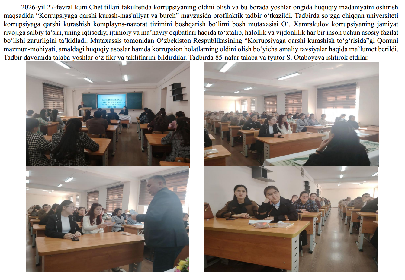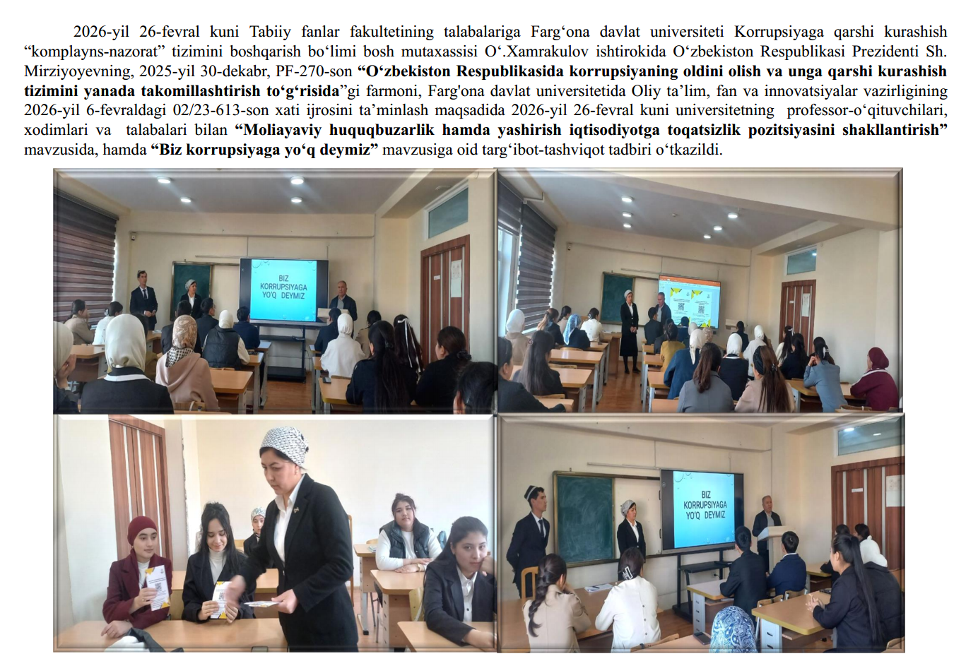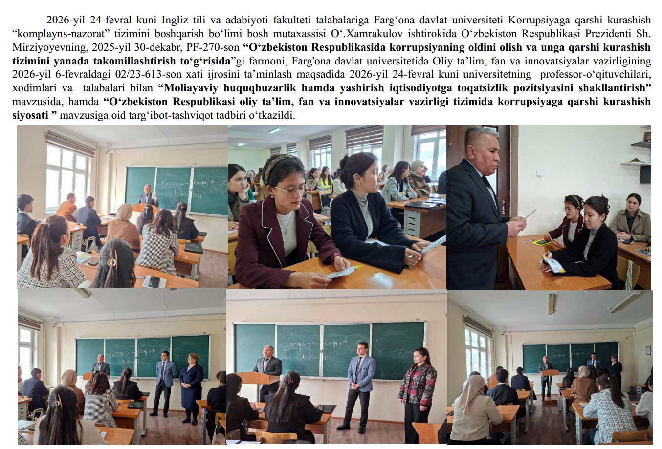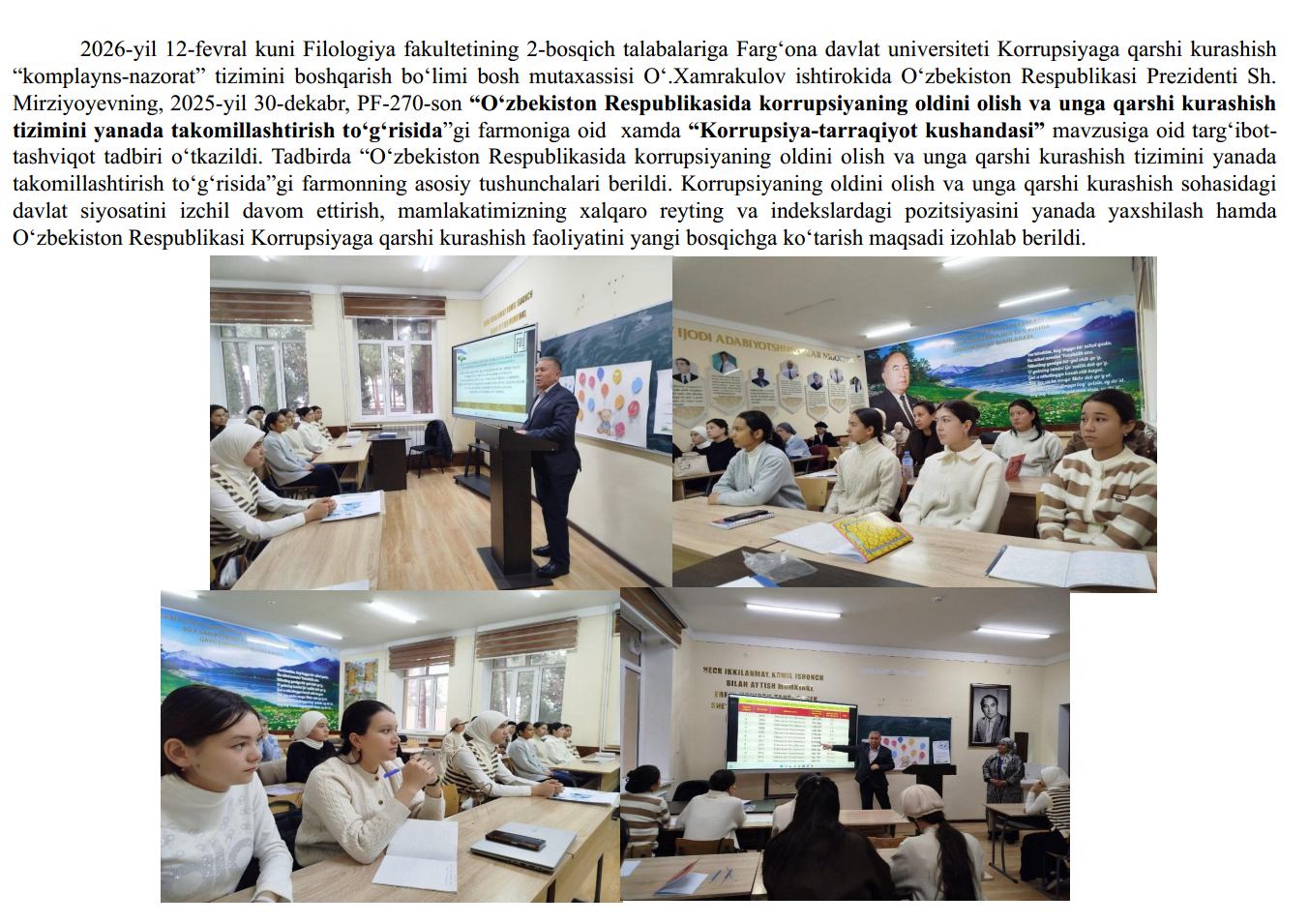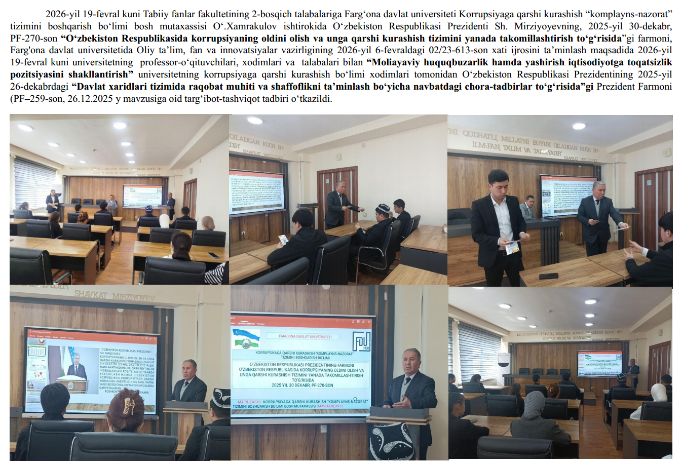 2026-yil 18-fevral kuni Fizika-matematika fakultetining 2-bosqich talabalariga Farg‘ona davlat universiteti Korrupsiyaga qarshi kurashish “komplayns-nazorat” tizimini boshqarish bo‘limi bosh mutaxassisi O‘.Xamrakulov ishtirokida O‘zbekiston Respublikasi Prezidenti Sh. Mirziyoyevning, 2025-yil 30-dekabr,