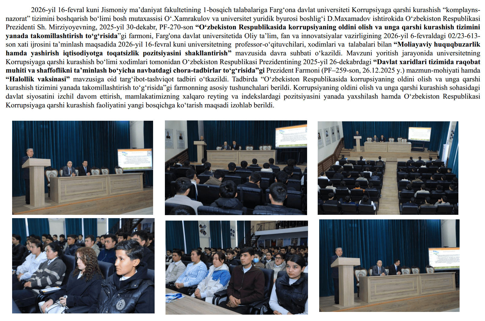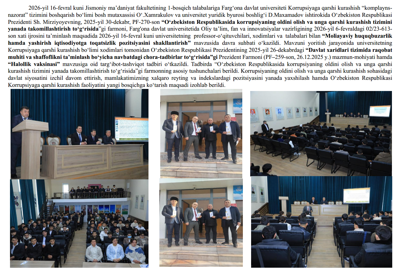 2026-yil 16-fevral kuni Jismoniy ma’daniyat fakultetining 1-bosqich talabalariga Farg‘ona davlat universiteti Korrupsiyaga qarshi kurashish “komplayns-nazorat” tizimini boshqarish bo‘limi bosh mutaxassisi O‘.Xamrakulov va universitet yuridik byurosi boshlig‘i D.Maxamadov, Farg'ona davlat universitetida Oliy ta’lim, fan va innovatsiyalar vazirligining 2026-yil 6-fevraldagi 02/23-613-son xati ijrosini ta’minlash maqsadida 2026-yil 16-fevral kuni universitetning professor-o‘qituvchilari, xodimlari va talabalari bilan “Moliayaviy huquqbuzarlik hamda yashirish iqtisodiyotga toqatsizlik pozitsiyasini shakllantirish” mavzusida davra suhbati o‘kazildi. Mavzuni yoritish jarayonida universitetning Korrupsiyaga qarshi kurashish bo‘limi xodimlari tomonidan O‘zbekiston Respublikasi Prezidentining 2025-yil 26-dekabrdagi “Davlat xaridlari tizimida raqobat muhiti va shaffoflikni ta’minlash bo‘yicha navbatdagi chora-tadbirlar to‘g‘risida”gi Prezident Farmoni (PF–259-son, 26.12.2025 y.) mazmun-mohiyatiga izox erildi.